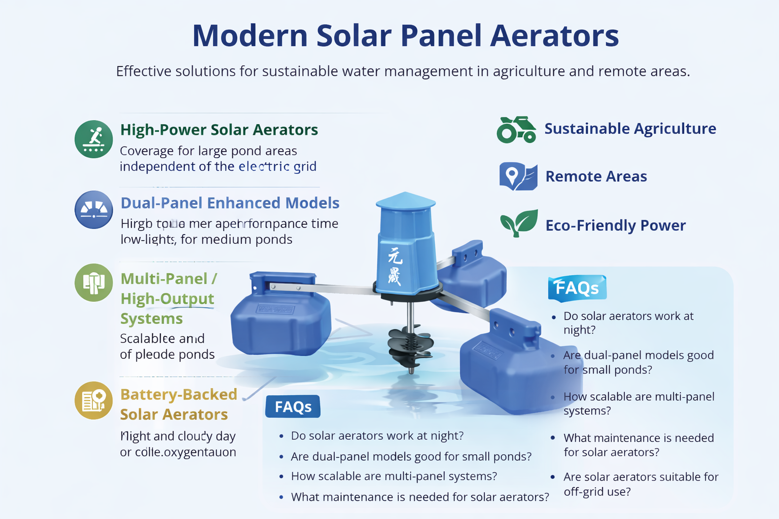 فى المجمل، حديث مهوية الألواح الشمسية توفر النماذج حلولاً عملية ومتعددة الاستخدامات لتهوية المياه. تدعم تصميماتها - بدءًا من الوحدات عالية الطاقة والأنظمة ثنائية اللوحة إلى التكوينات متعددة الألواح والإعدادات المدعومة بالبطاريات - الإنتاجية الزراعية واستدامة النظام البيئي والإدارة الفعالة للمياه في المواقع النائية.